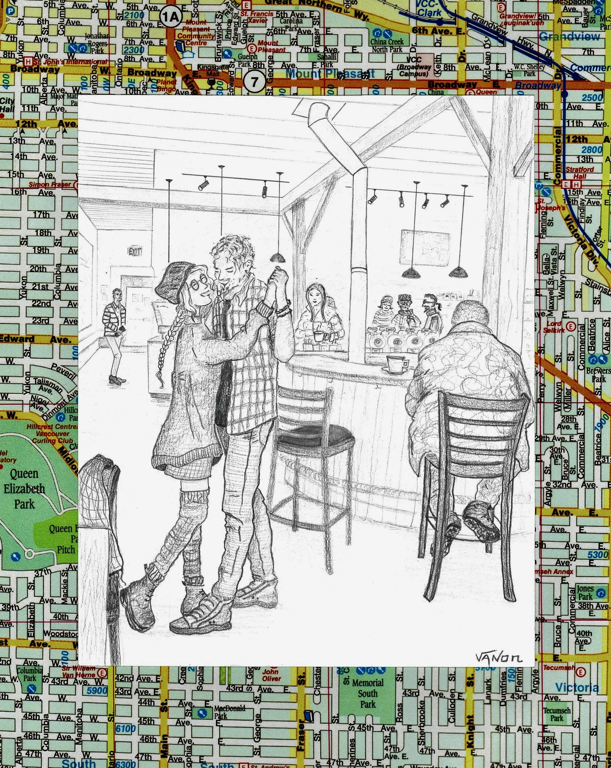 The “Noticed in Vancouver…” drawings are graphite-on-paper originals. Some artworks include ink and watercolour pencils/paint.
